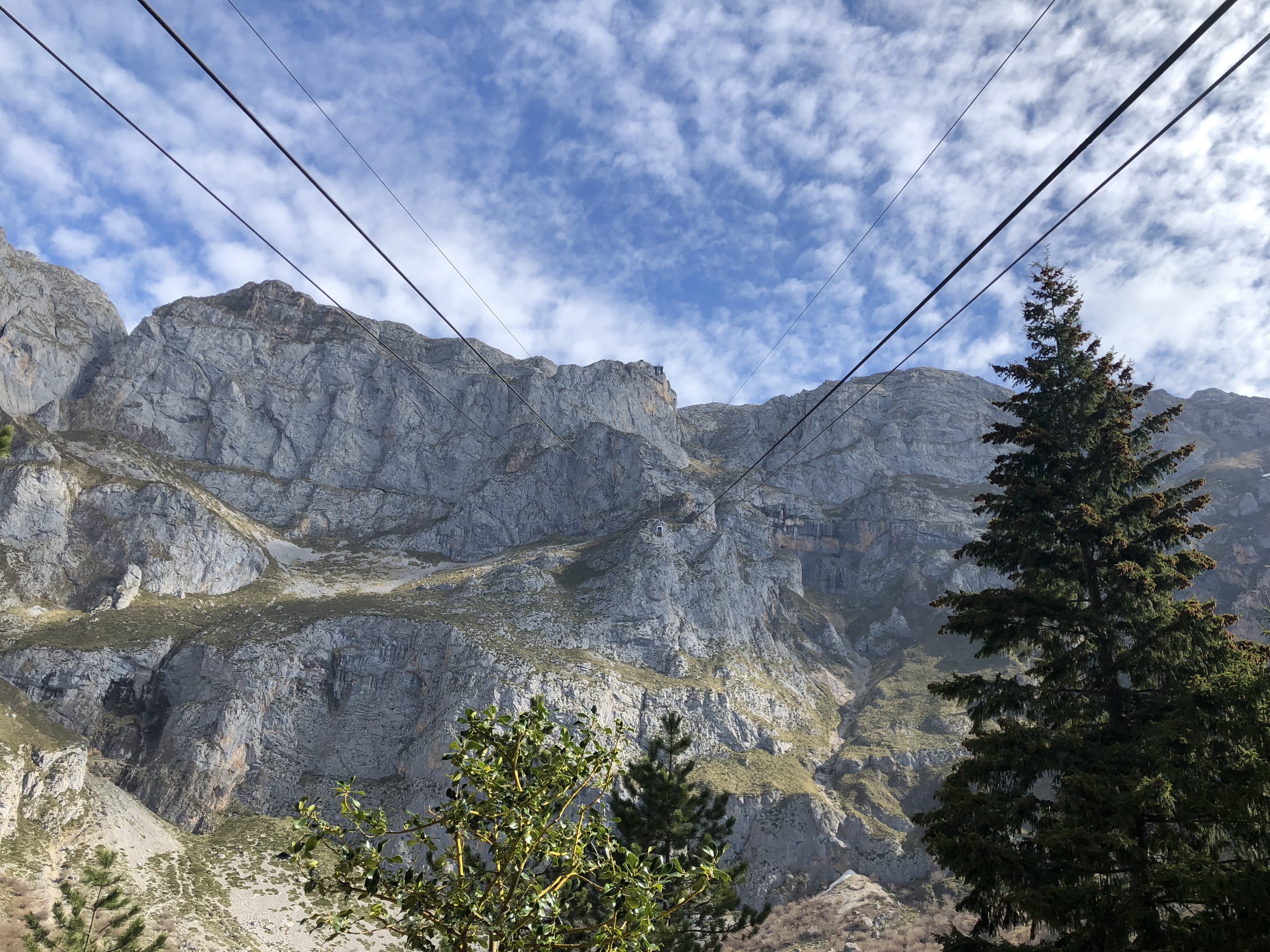 To the right, you can see the view of the car taking you up into the mountains. It looks incredibly steep as you stare up at the wires at a seemingly impossible near vertical angle. Your ears will pop a few times on the ride up.