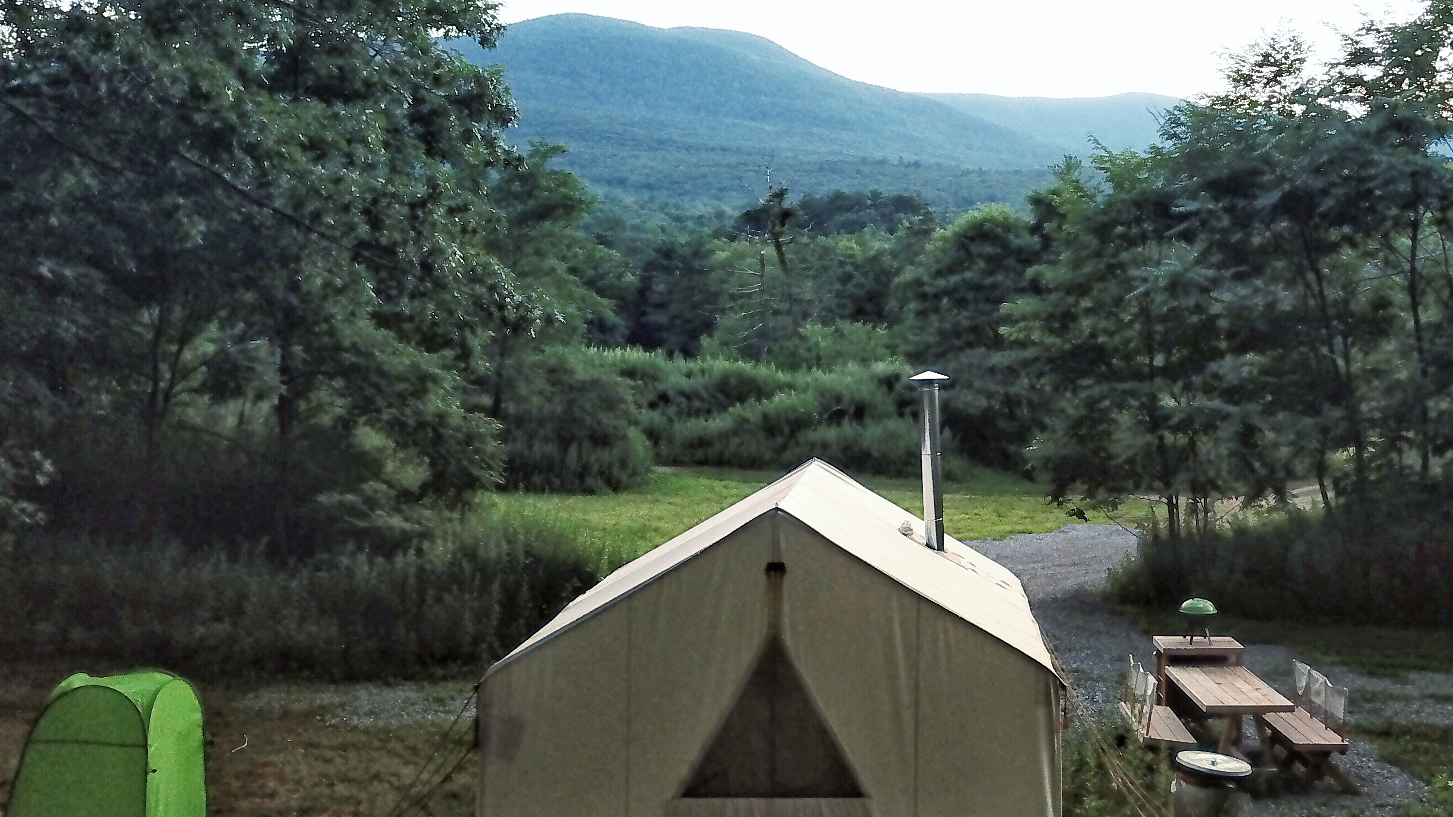 Speaking of the campground, there was a total of four glamping sites to choose from, each with ample privacy and features. We stayed at the Overlook Site, which provides a grassy knoll to gaze out on and watch sunsets. The other options were a wooded site in a forest, a spot known as Fido’s Vineyard (accompanied by an old barn with picnic tables), or the Mountain View site, which faced the escarpment ridge of the Catskill Mountains. Even if all of the other sites are occupied during your stay, you are unlikely to hear or bump into anyone else, as they are quite spread out. Nothing like a busy state park campground on summer weekends, where it can feel like a tent neighborhood rather than a campsite!