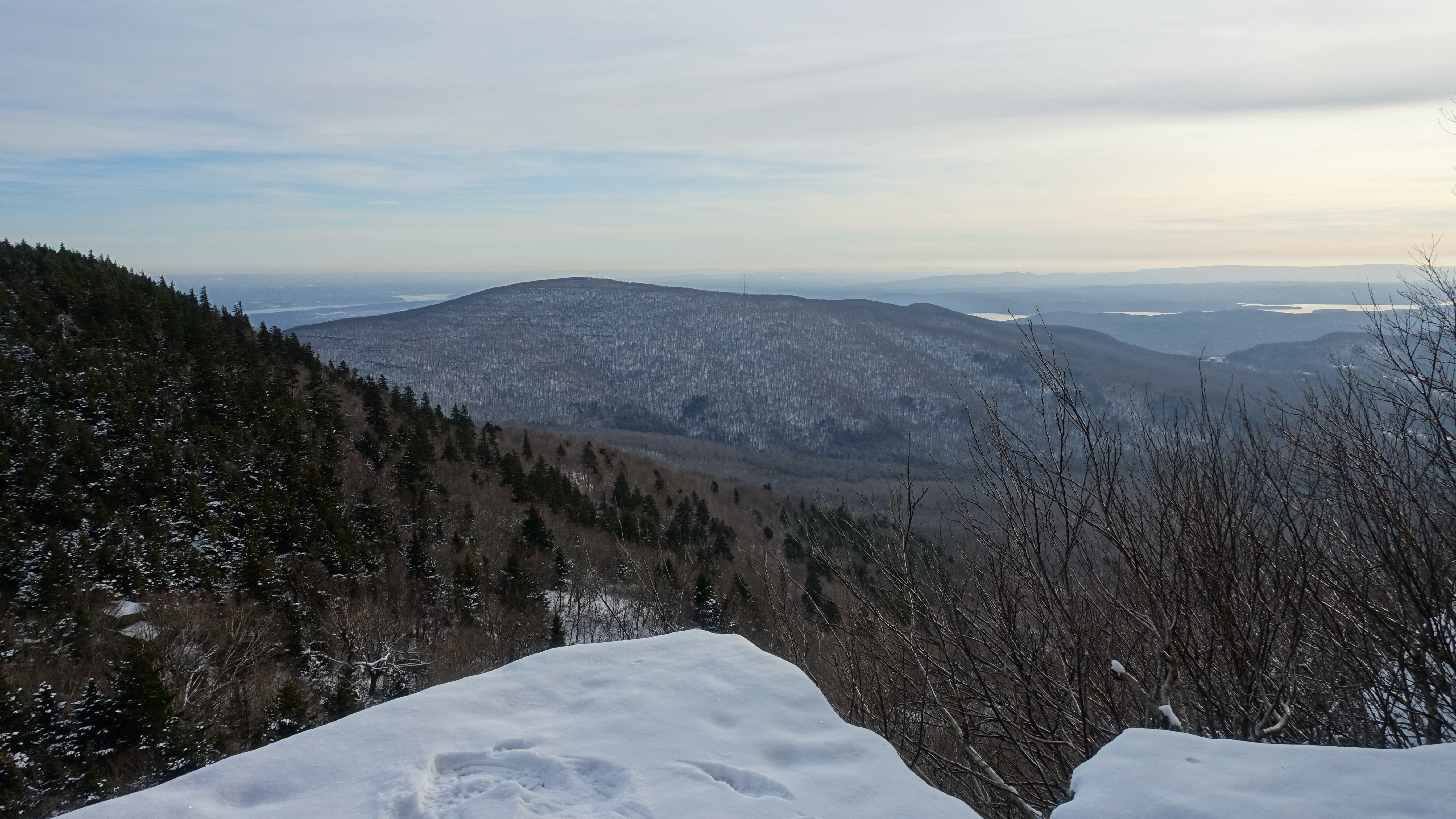 From Jimmy Dolan Notch, you’ll have about 500 feet of elevation left to gain. About .2 miles in, you will come to the small crack/scramble shown below, which can be a little tricky to pull yourself up and through. To the right, you can use the tree roots as a handhold, or to the left you can try to squirm your way over the ledge, as its a bit too tall to step up from the ice building along the crack’s base.