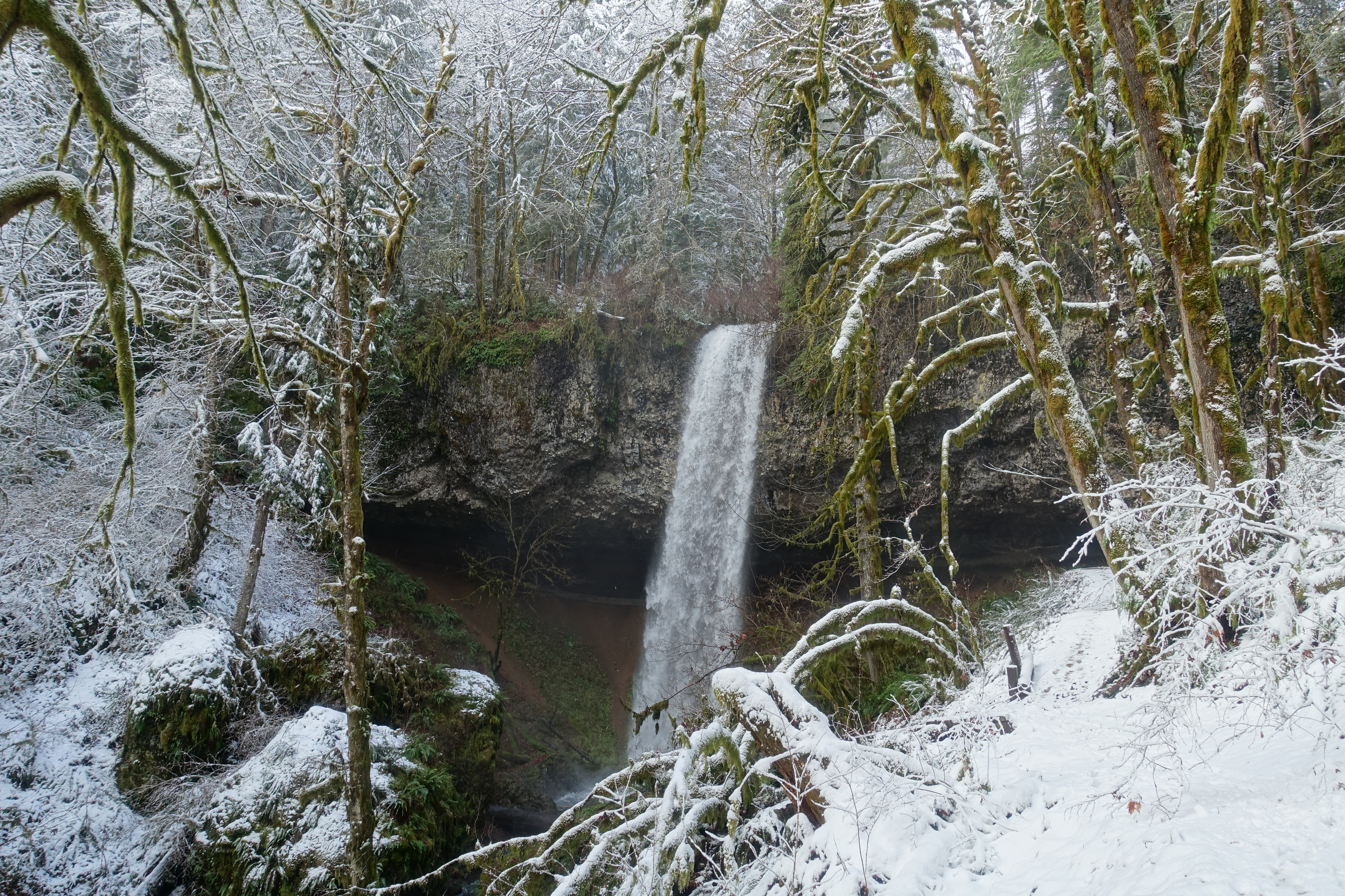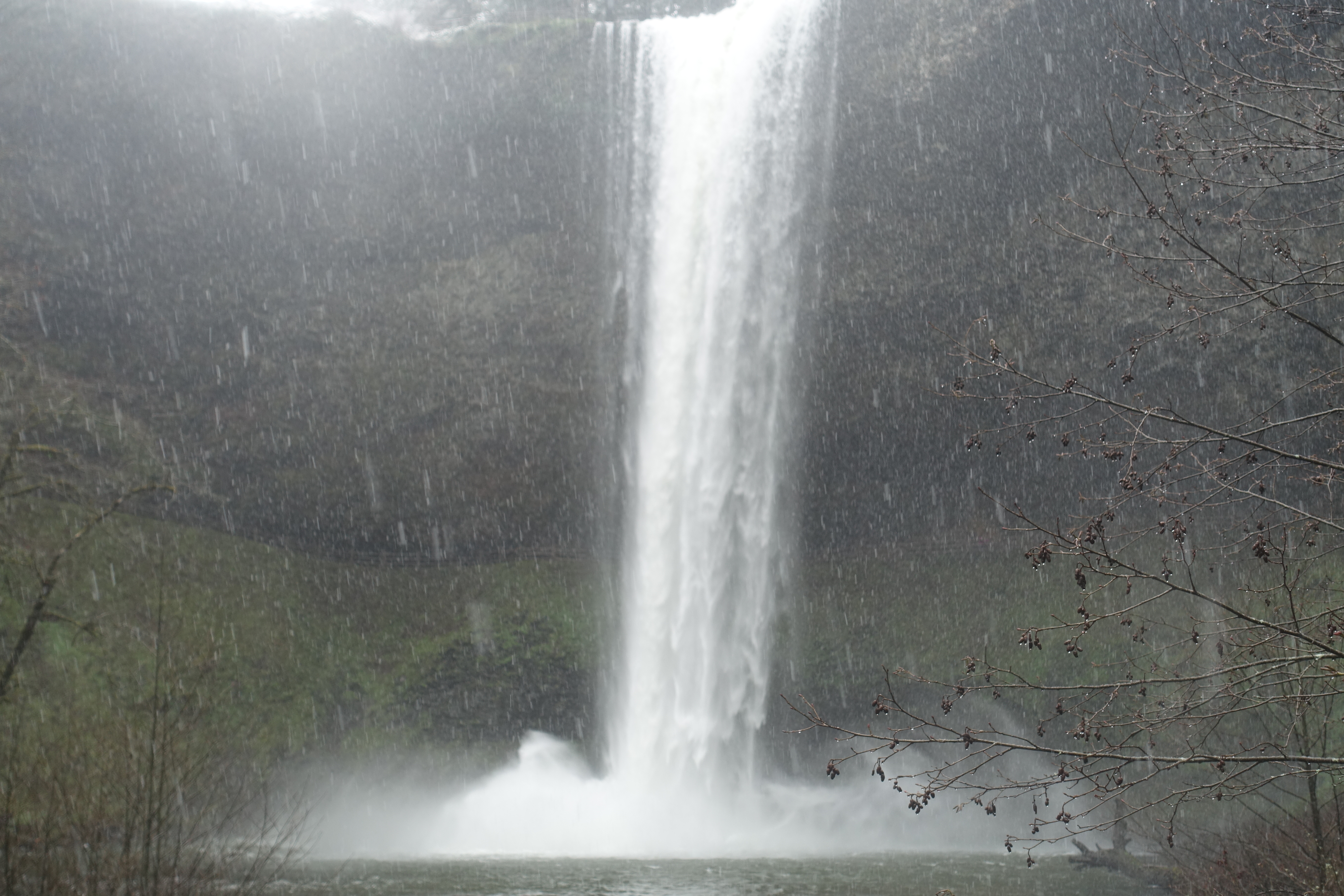 The morning started with aspirations (however wishful) of making it to the Three Sisters Mountains at the edge of the Cascades, but a snowstorm made us turn back before even reaching the halfway point. While the accumulation was not overly deep, our car was only equipped with all season tires, and was starting to slide just a little in the deeper slush. Not wanting to get ourselves stuck and in need of an expensive tow, we turned back at the town of Gates and settled for another waterfall trail closer to civilization – the Shellburg Falls trail in Stayton, Oregon.