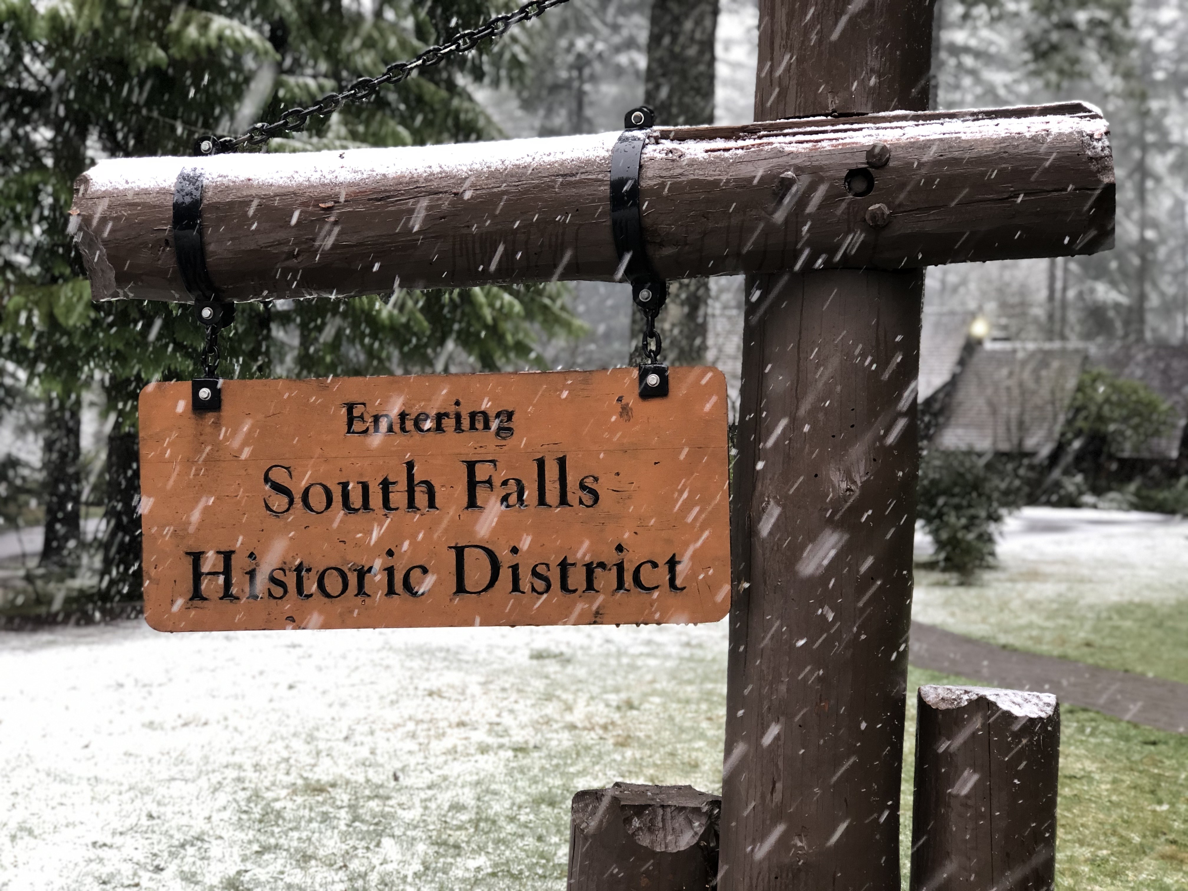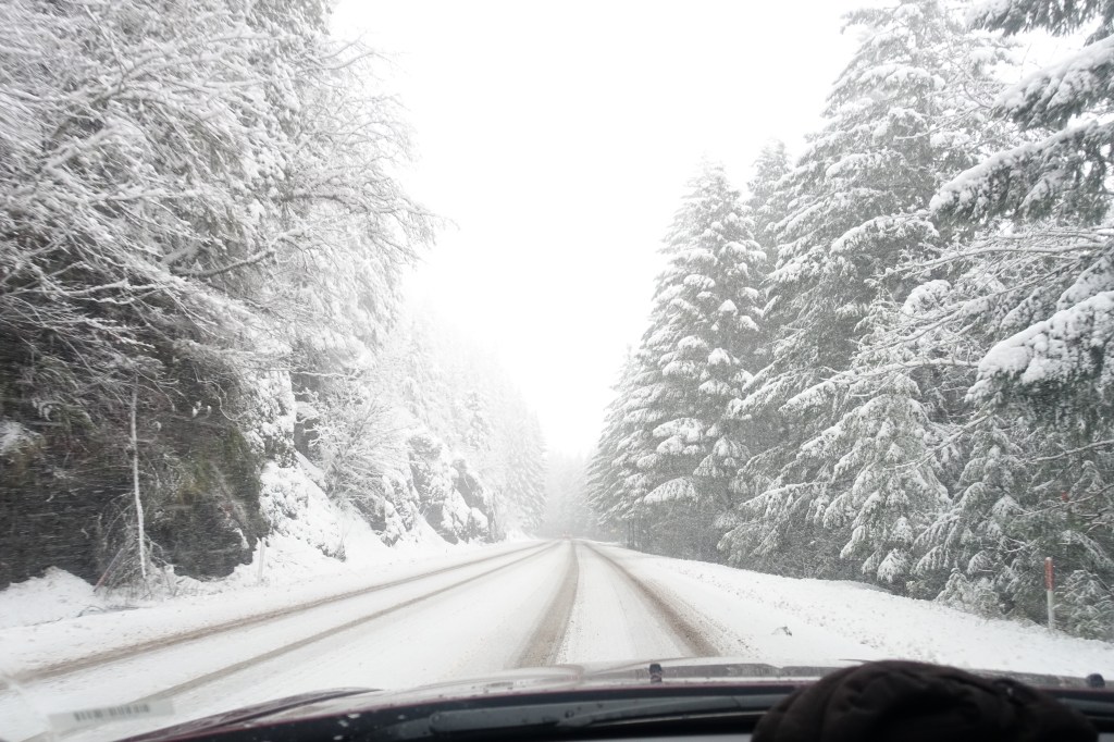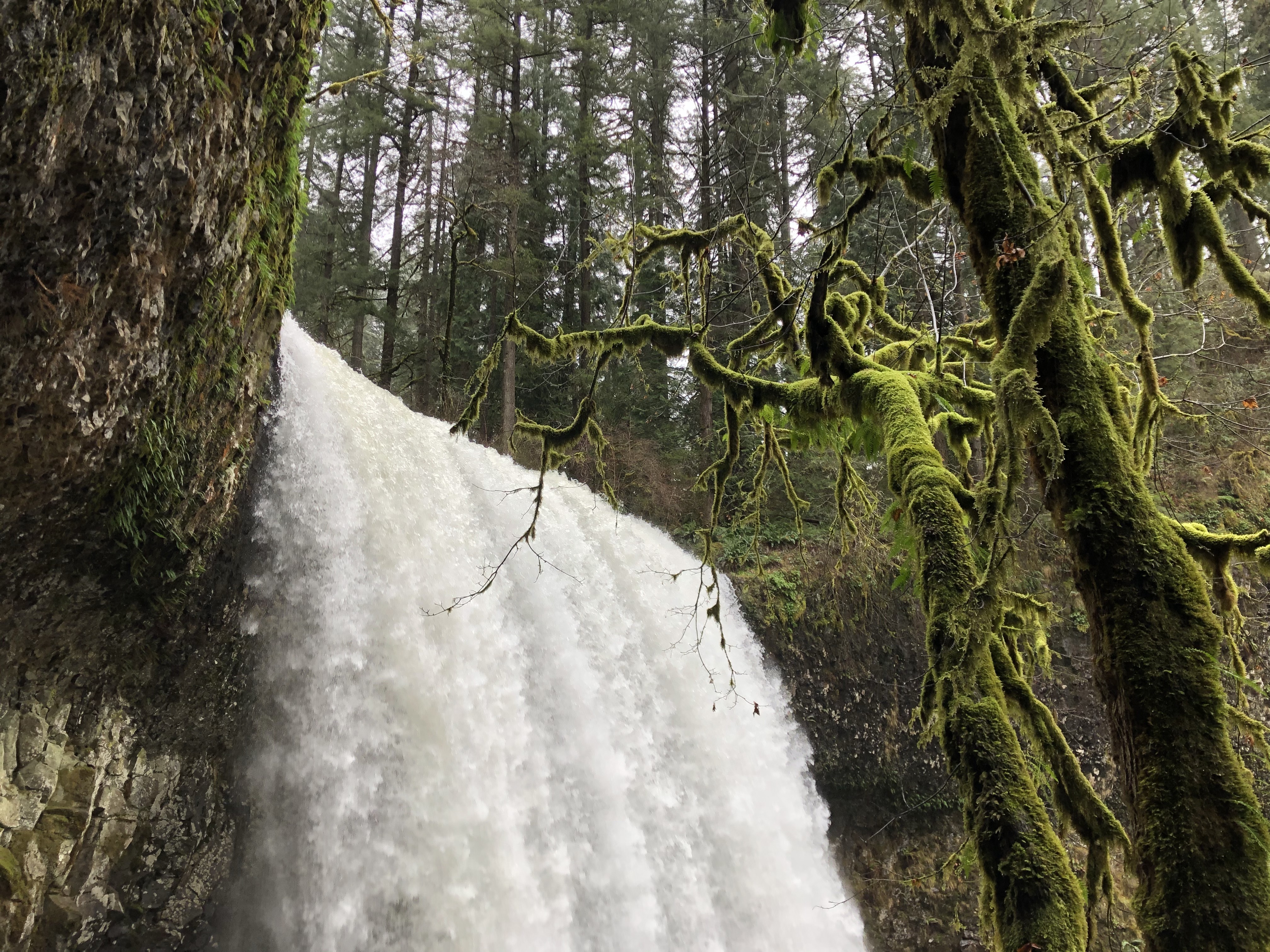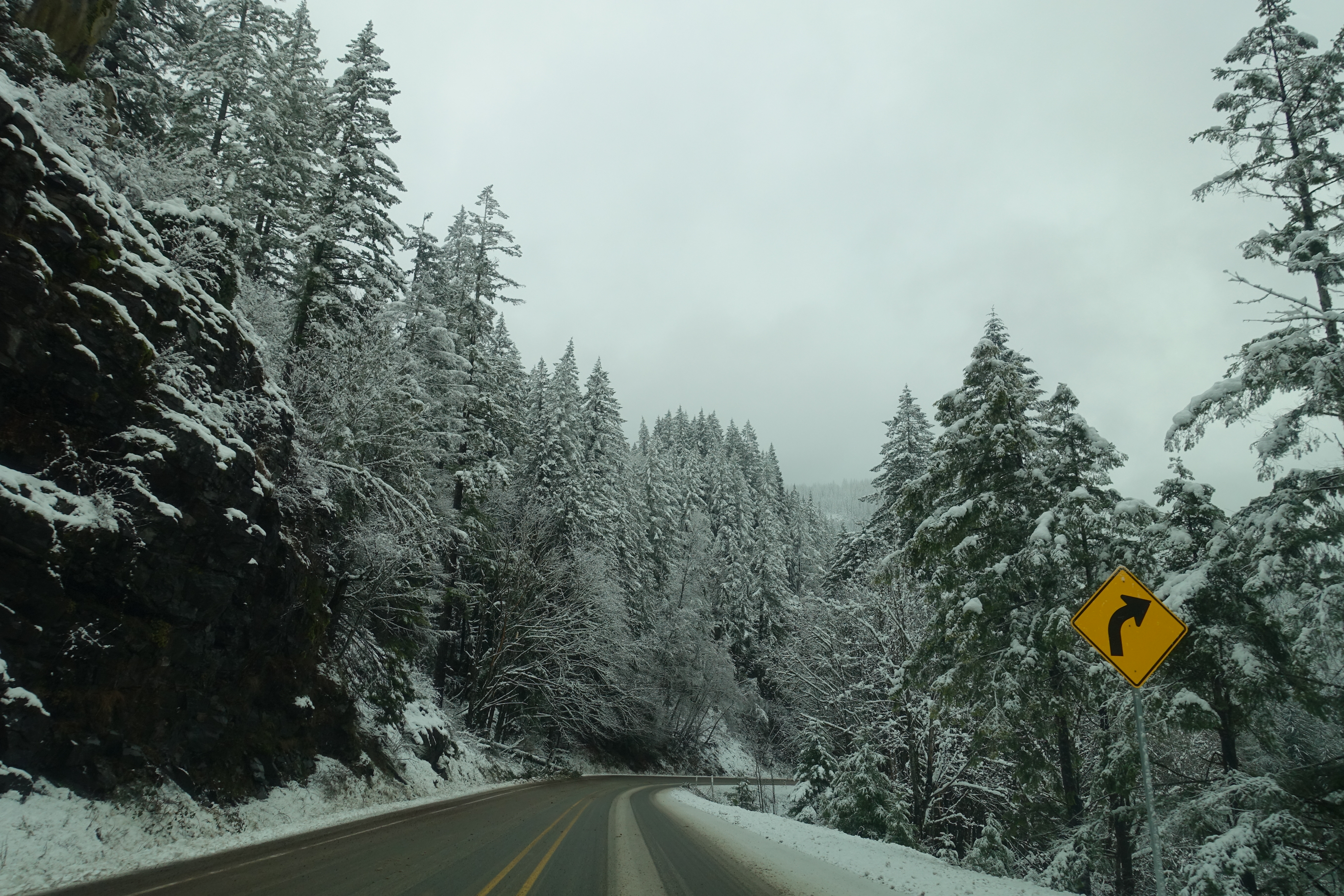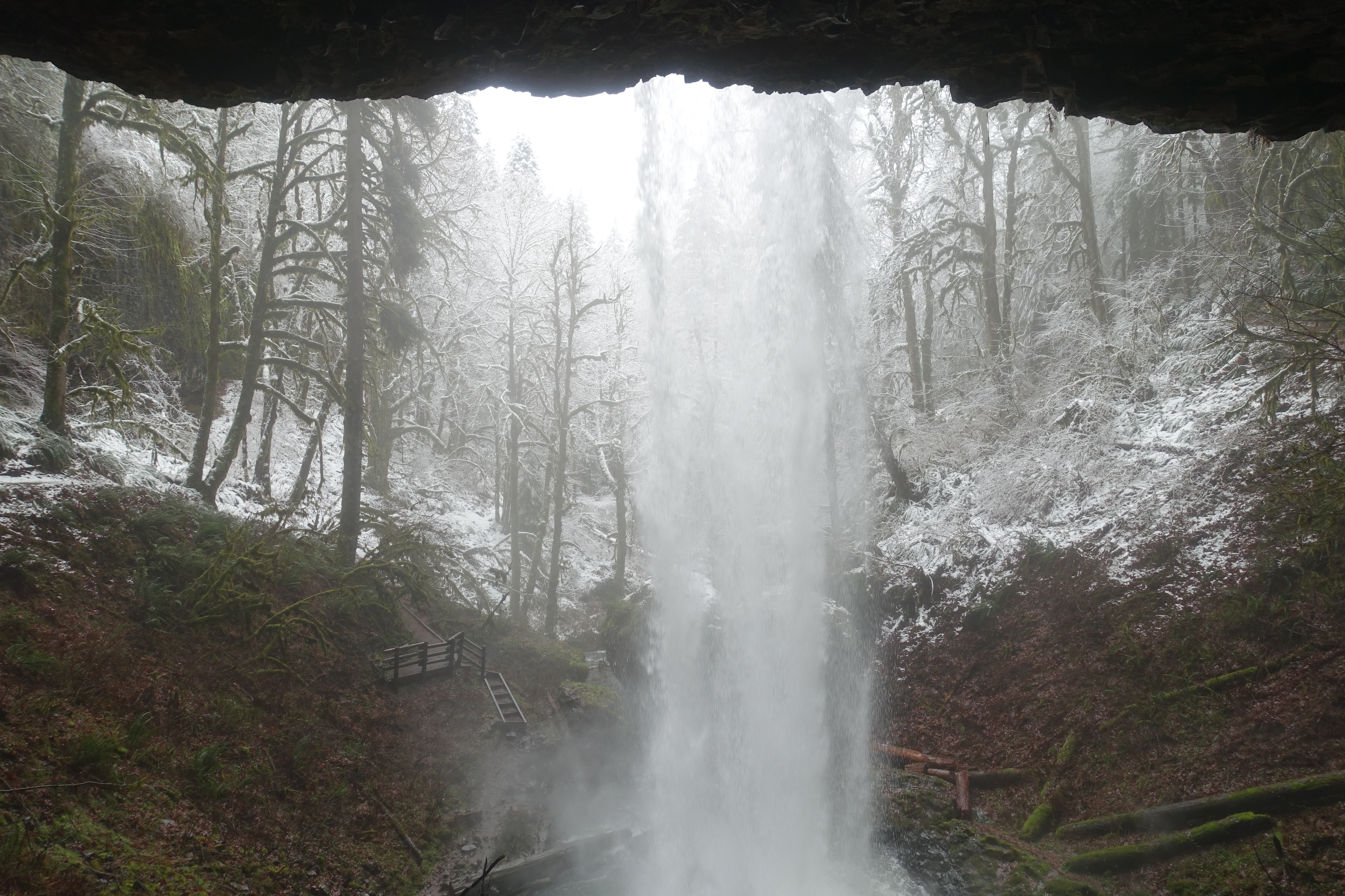 We left Portland that Monday morning to head southeast to a waterfall-lined trail in Silver Falls State Park, about 20 miles away from Salem (and about 30 minutes from our next AirBnB in Keizer). Getting there gave us our first taste of snowy driving in Oregon, as flurries and a bit of slush started to stick to the road and trees above. Beautiful, and the AWD in the sedan handled it flawlessly. And – the snowfall made for a particularly beautiful hike, as many of our surroundings had a fresh coating.