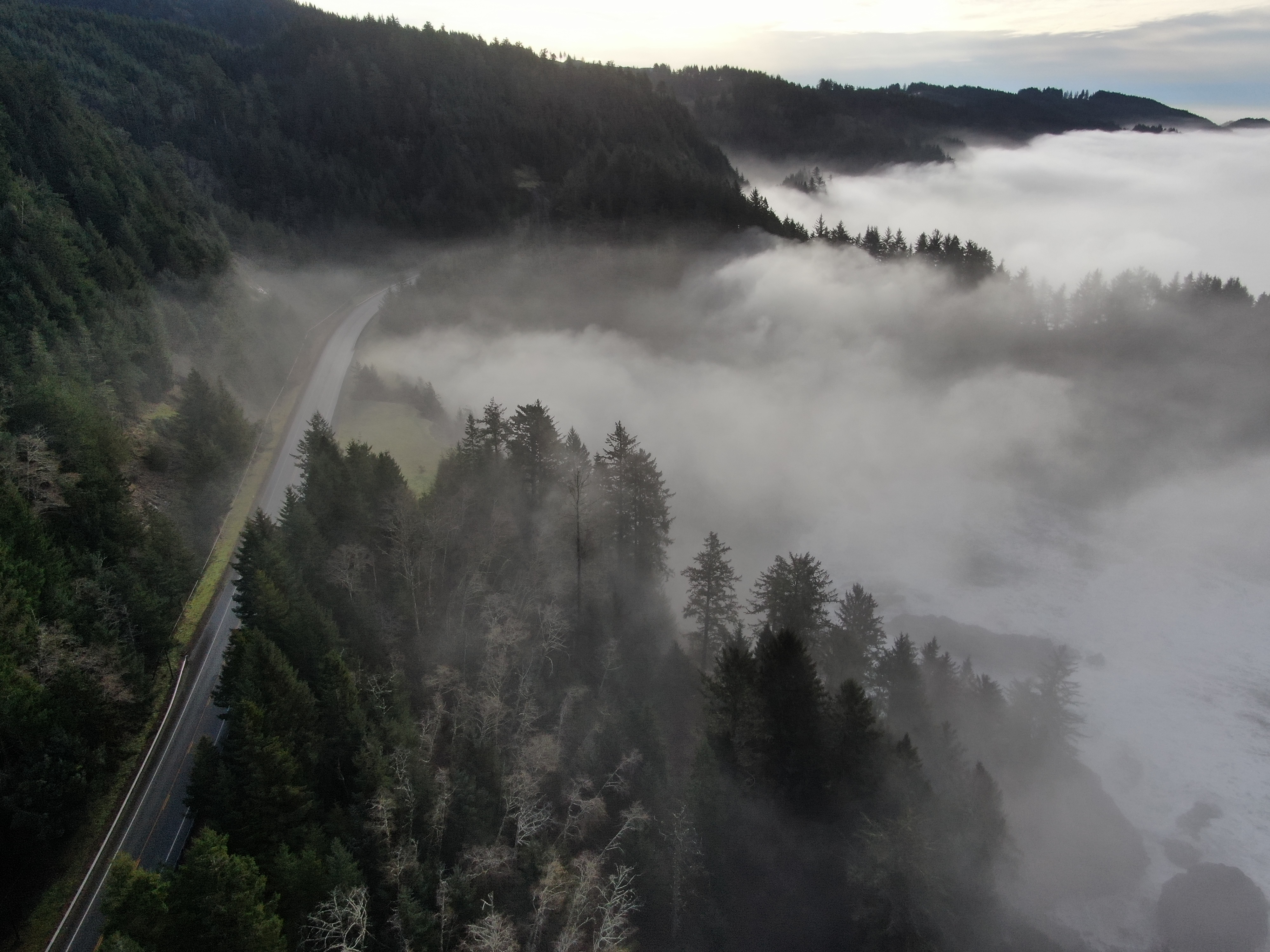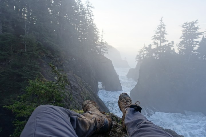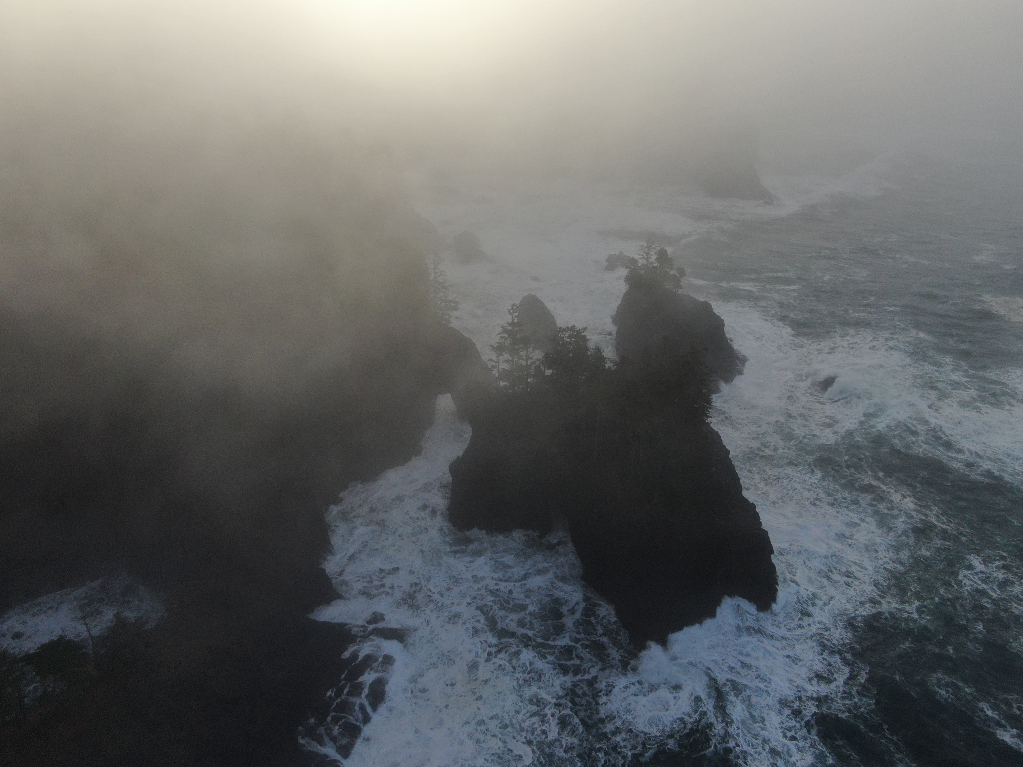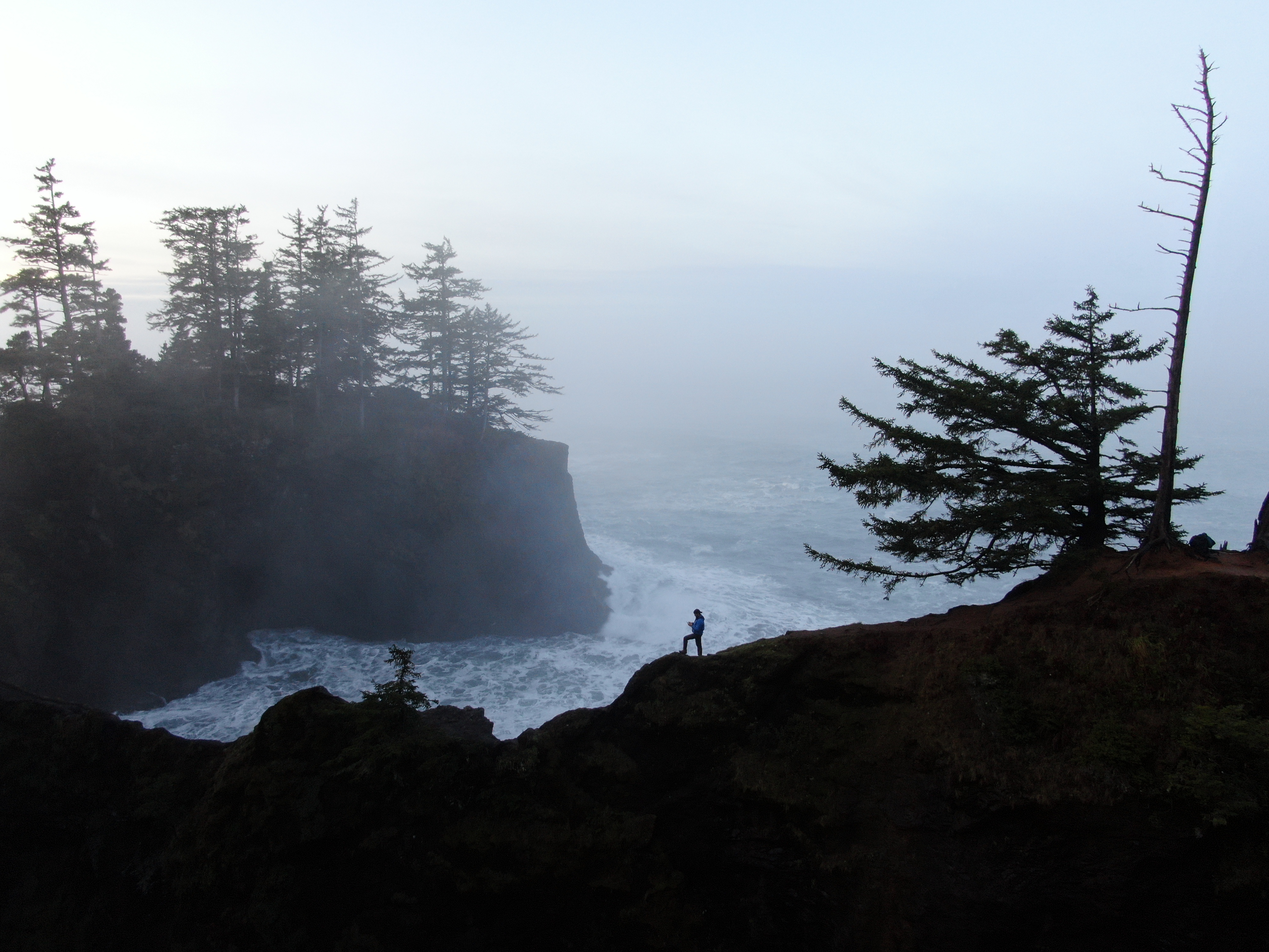 We got up at the crack of dawn and quickly set out for the 45-ish minute drive to Brookings where we would find the natural bridges along the coast. These rock formations were made by erosion and weathering over millions of years, and provide an unrivaled landscape to watch a foggy sunrise. Starting on the trail right with the first light, we trekked through the short but steep trail down to the beginning of the ridge that led to the bridge over the rough surf below. While there was a viewing platform set far back by the parking lot, I knew I wanted an up-close experience for this one.