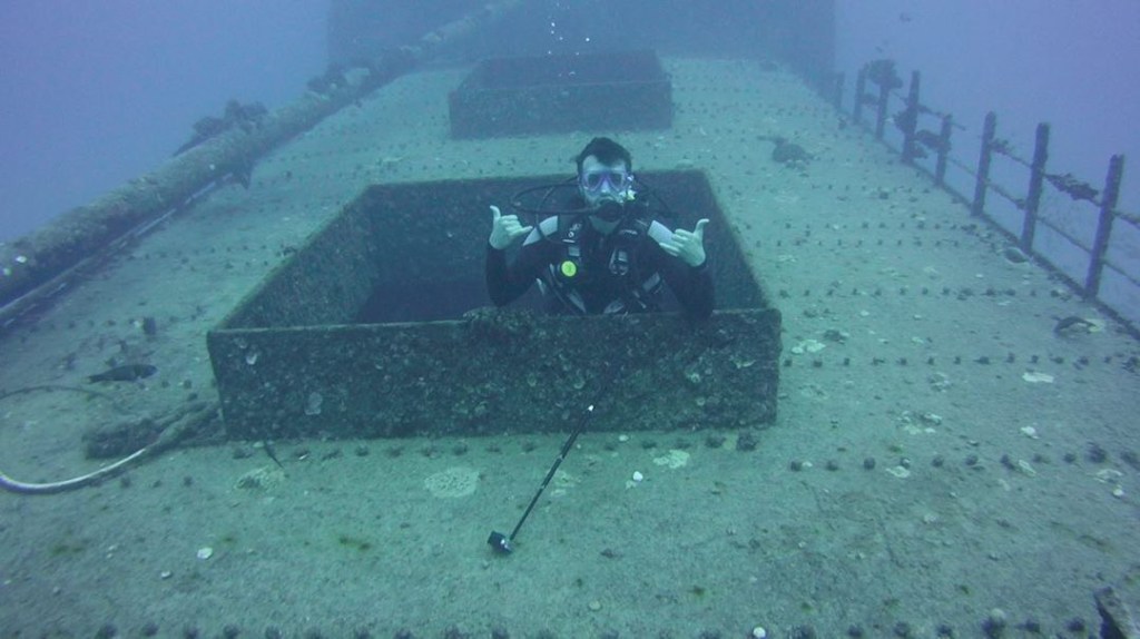 There are several shipwrecks in Oahu, Hawaii that are accessible for divers – and the Sea Tiger is one of the most visited – for good reason, as its still incredibly well intact. It was intentionally sank in 1999 as a marine and coral rehabilitation project. The ship rests in about 120′ of water, but the decks and structures are at about 90-100′. There are even a few areas to swim through the hull – below you can see me popping out from inside of the cargo hold. Make sure to consult with your dive leader about conditions and safety to penetrate any part of the wreckage, and only do so if you have the proper training and experience.