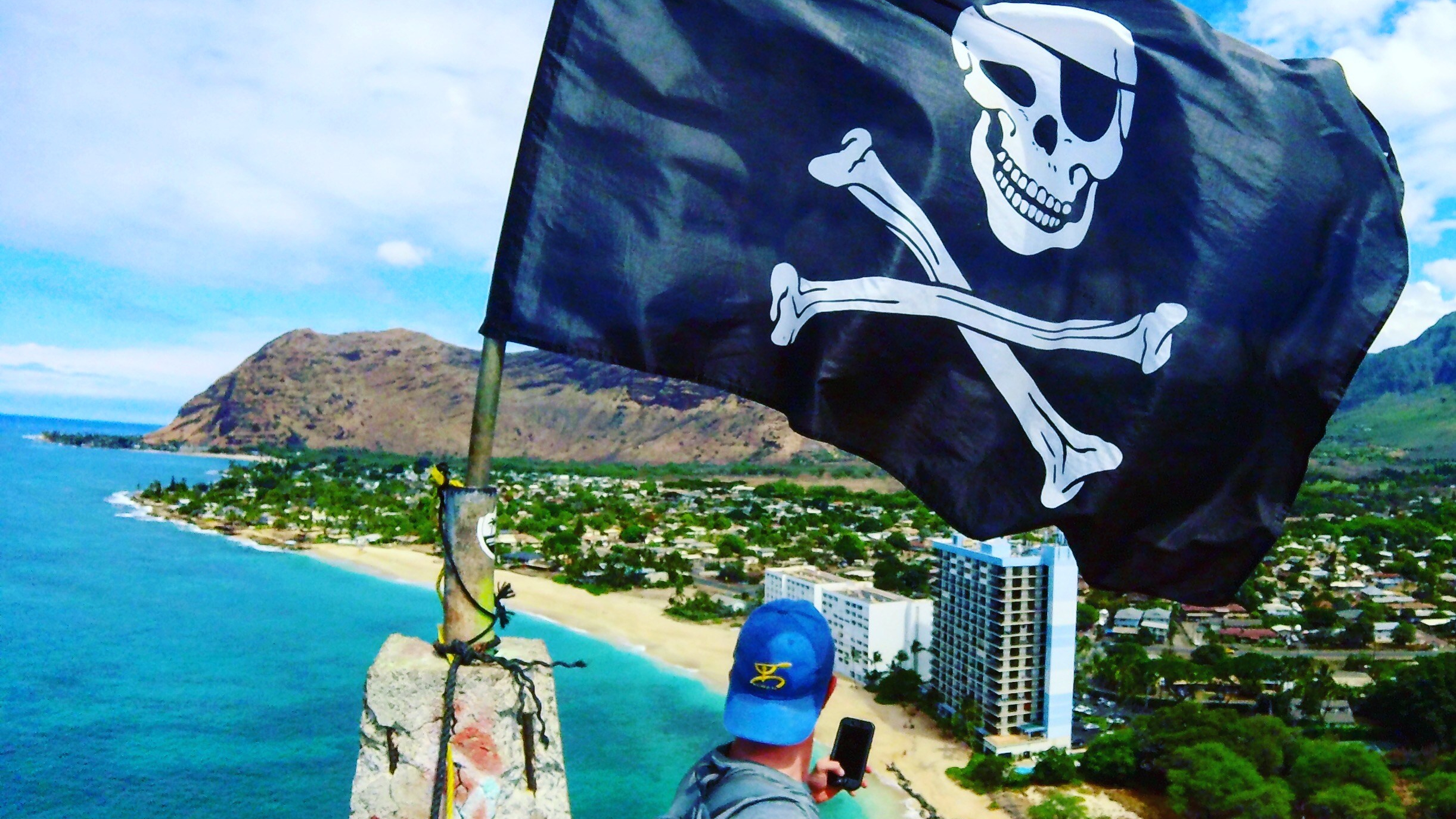 Once you’re there’ you’ll have panoramic views around up and down the beach, with the mountains in the background. And of course, the Pirate Flag.