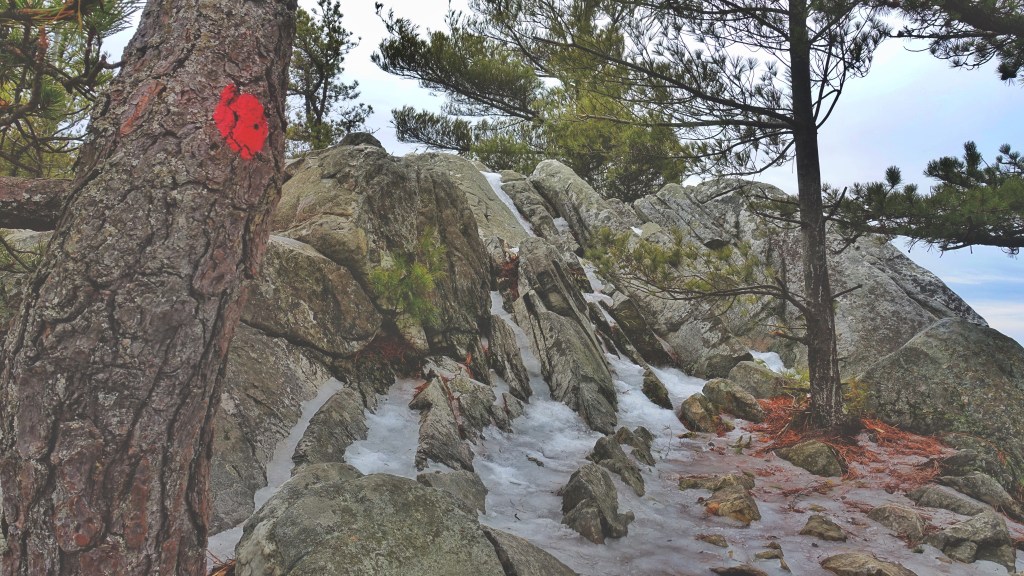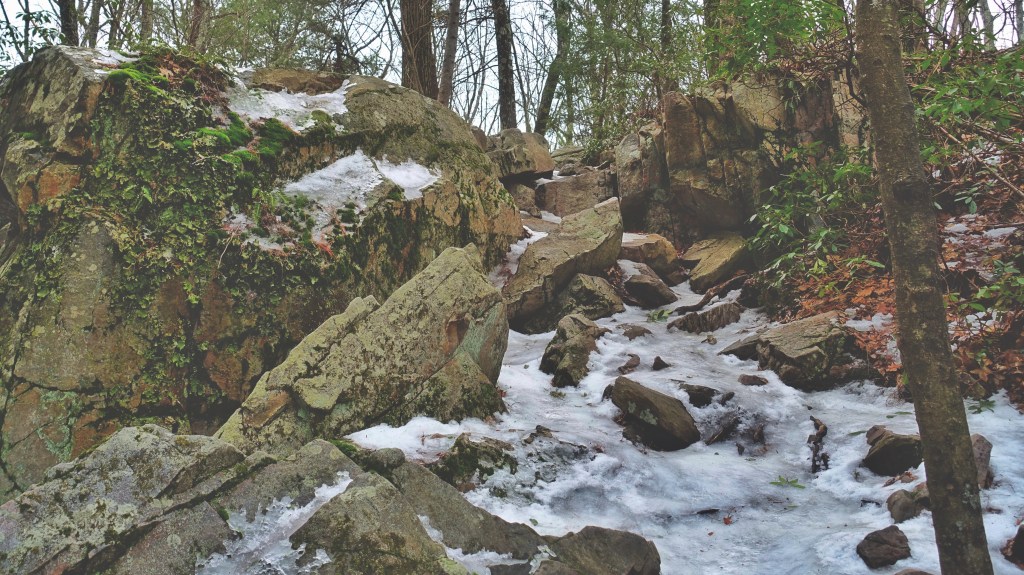 If you’re used to tackling peaks in the Adirondacks, Catskills or White Mountains, the ascent here won’t take you on a thrill ride, but its nonetheless a very pleasant hike. You’ll gradually pick up elevation as you wind through the forest and around large quartzite boulders. For a short section you follow the trail along a stream that leads up to small waterfall as you continue up the trail (shown below). After a lot of rain, the one stream crossing might be a little tricky, but it wasn’t too bad when I went in late February.