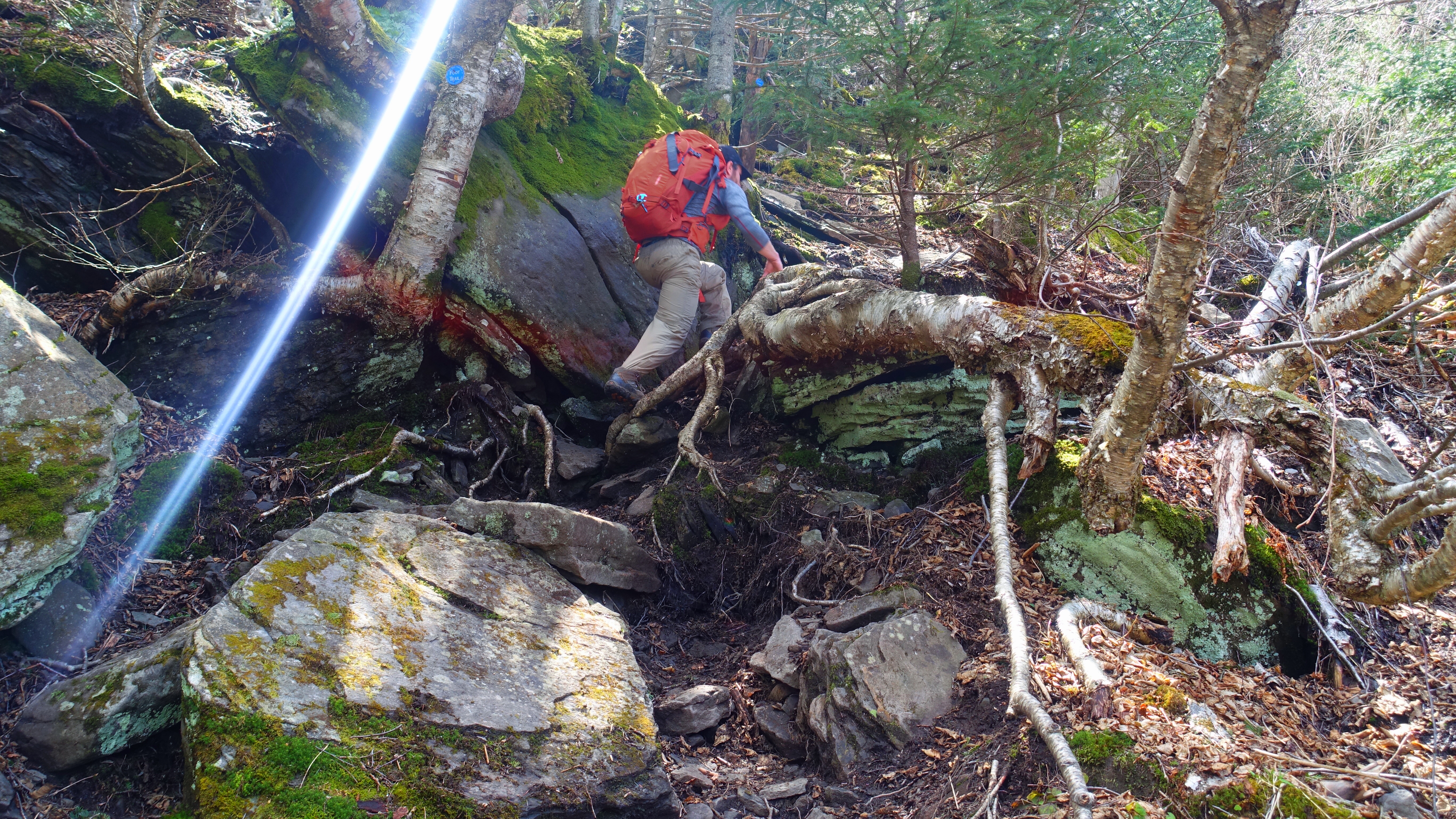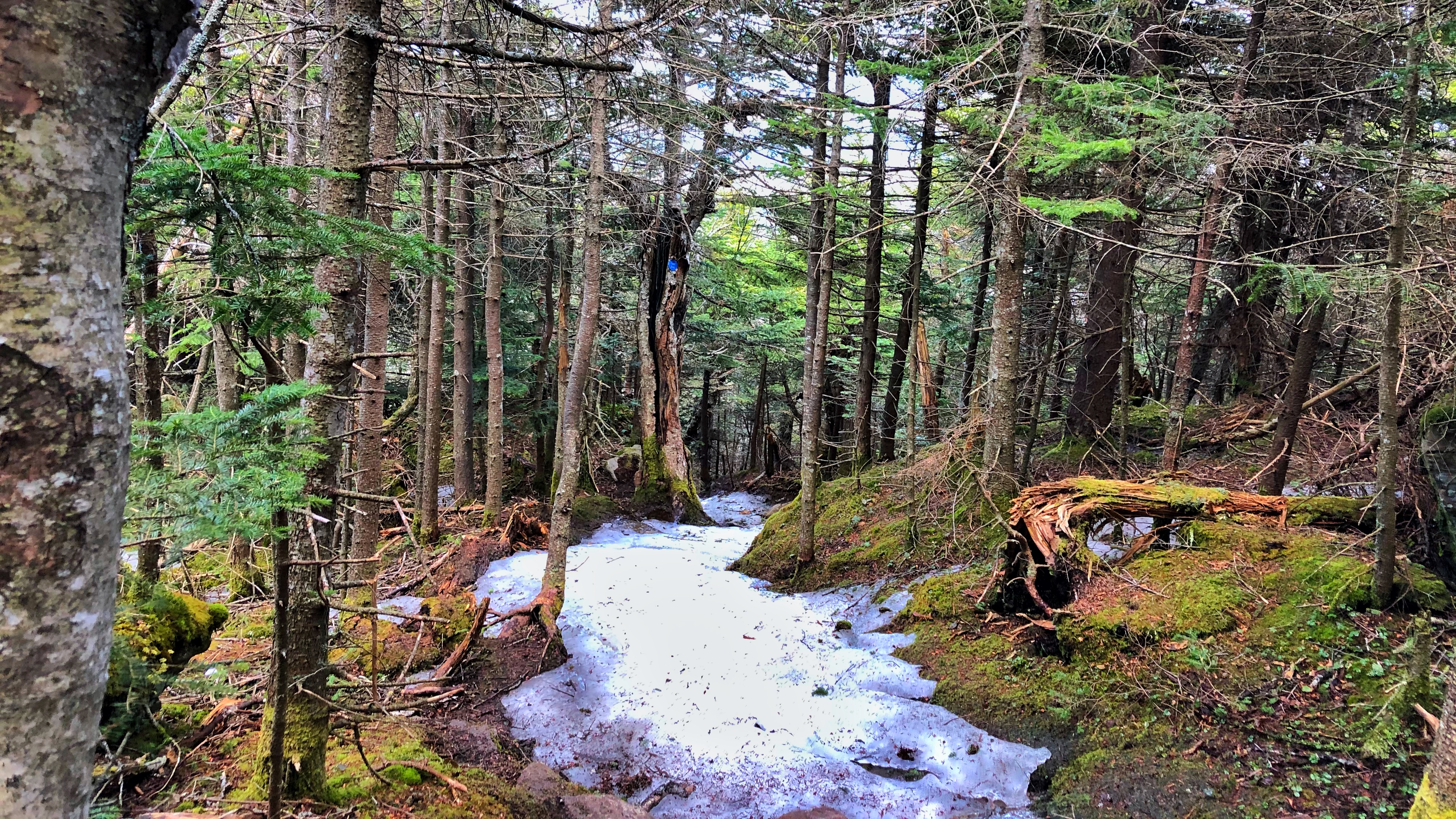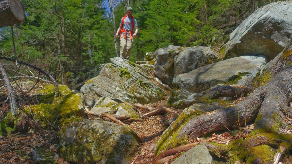 Due to some of the ice on the trail during my first run up to Blackhead in early May, I returned again to get pictures going through the obstacles with someone to help take pictures later in the season. Even by mid-may, there was still a little bit of ice left on the trail. Hence the changing hats and sleeves that change length between pictures!