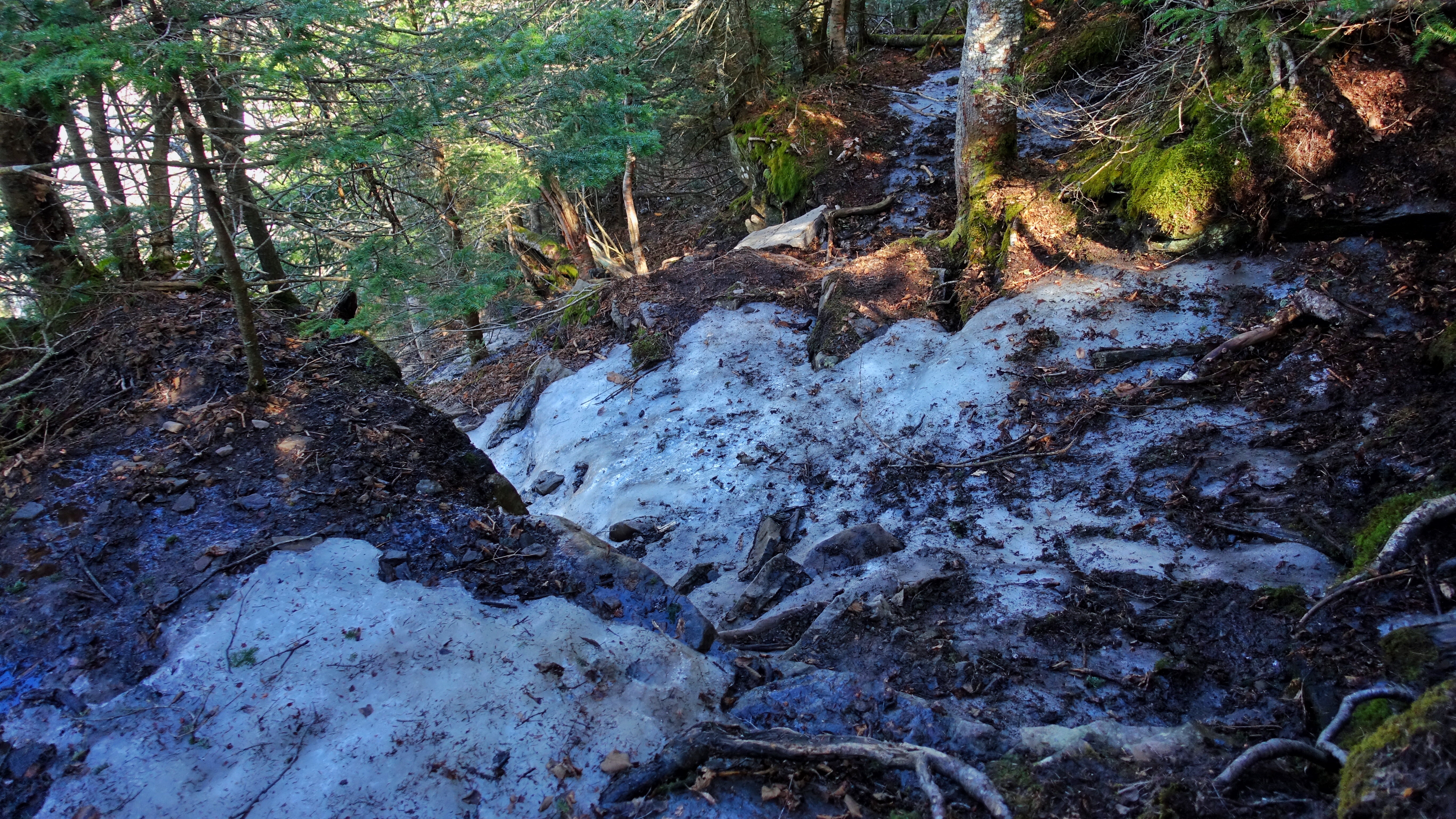 And then, when you get to about the last third of a mile to the summit of Blackhead, you’re likely to encounter some ice in the early and late shoulder seasons. Expect winter conditions on this hike later than many others in the Catskill Mountains. The melting ice flows covered much of the trail, and there were several sections in particular (shown below) that required very precise boot placement as well as the assistance from trees beside the trail. It was here that I contemplated turning back – but knowing that the descent would be even more cumbersome, I pushed on.