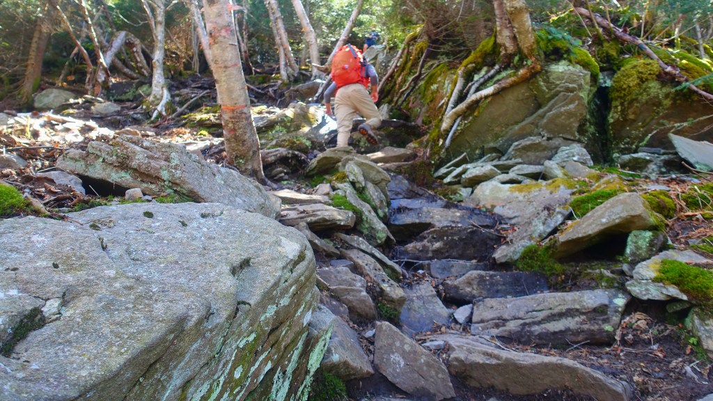 From Acra Point, you’ve got another 2 miles to go along the Blue (Escarpment) Trail before you get into the challenging ascent portion. You probably won’t pass many other hikers from here until the summit, as its not a particularly popular route. You’ll actually descend a bit into the col between Acra and Blackhead and lose about 200 feet of elevation in the process. Its a gradual drop with a few rock slides to keep it interesting.
